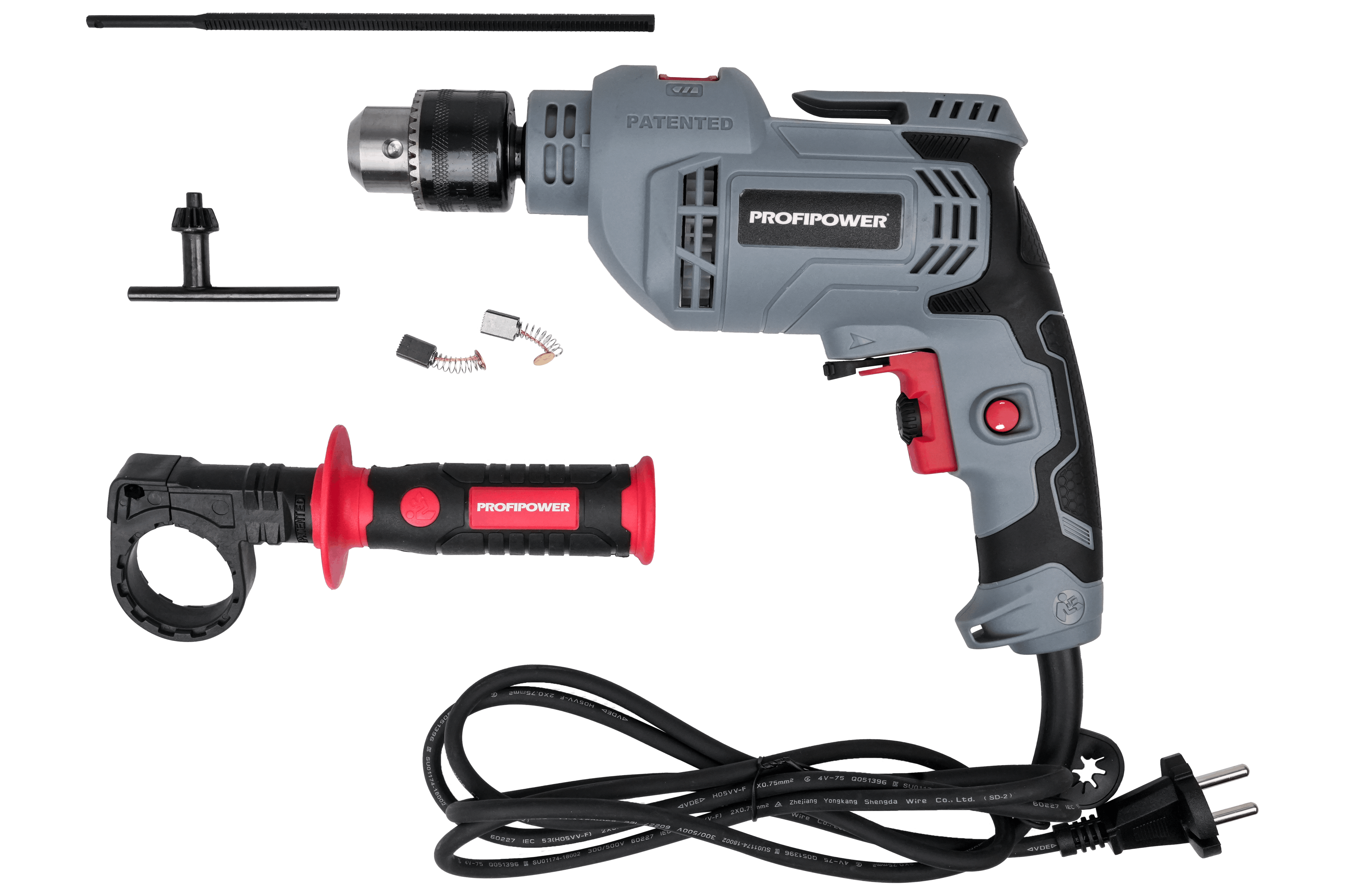 Дрель 1 шт Дополнительная рукоятка 1 шт Ключ 1 шт Ограничитель глубины сверления 1 шт Запасные угольные щетки 1 шт Инструкция с гарантийным талоном 1 шт -